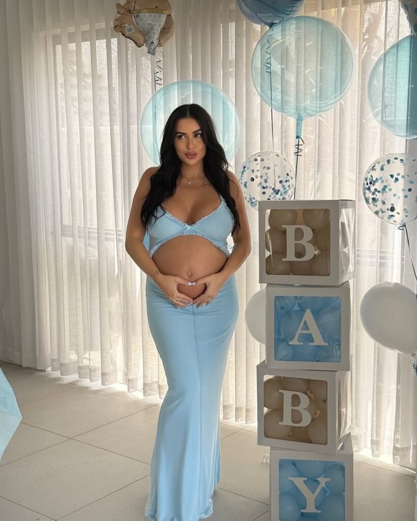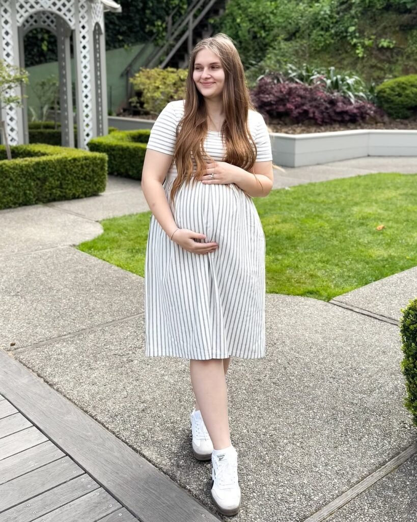 Styled with tan sandals, it creates a laid-back yet elegant vibe — ideal for moms-to-be who want to feel as amazing as they look.