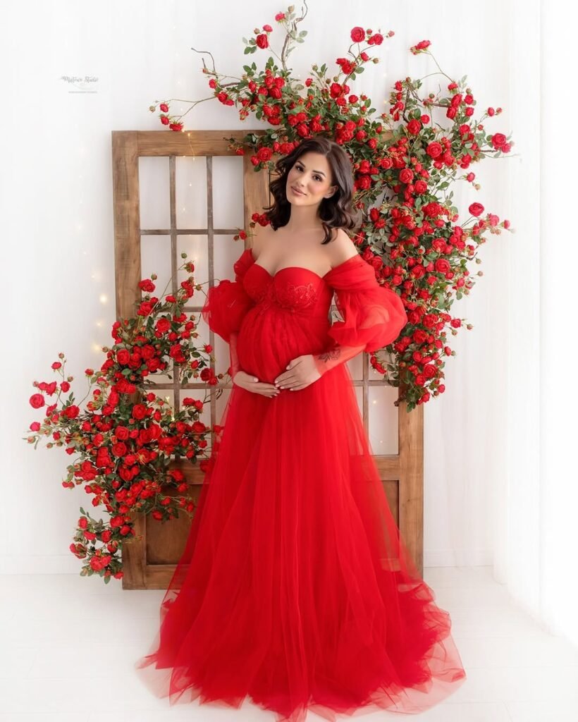 The flowing skirt adds a touch of luxury, making it perfect for a glamorous baby shower or special occasion. Ideal for moms-to-be who want to stand out with a striking, confident style.