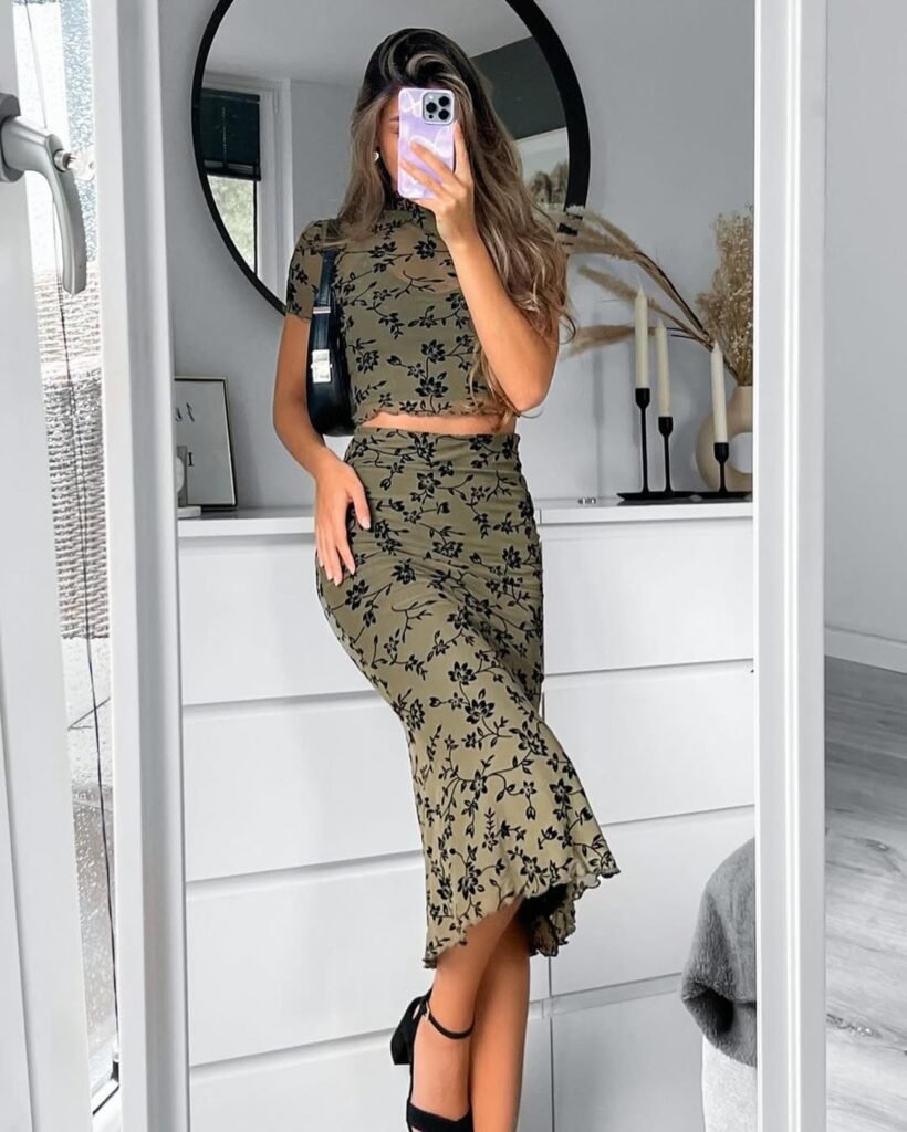 The olive green floral crop top keeps it fresh and playful for any occasion. Matching midi skirt flows beautifully and adds an effortless, feminine touch.