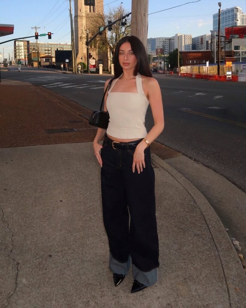 The white halter top keeps the look sleek, minimal, and perfect for warm days. Dark wide-leg jeans with a cuffed hem add a bold, trendy statement.