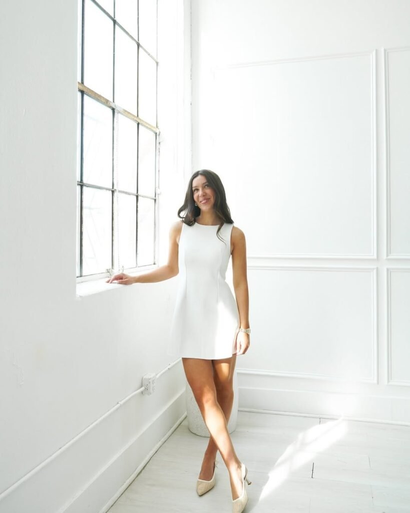 The white sleeveless mini dress creates a fresh, clean, and timeless look that works perfectly as an after prom outfit. Its fitted silhouette flatters the figure while keeping the overall style simple, elegant, and effortlessly chic.