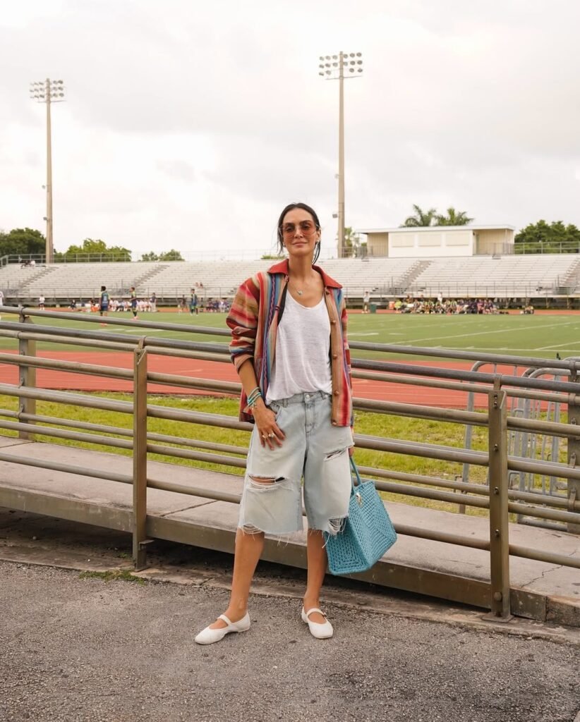 The oversized striped jacket adds a vibrant pop of color to this relaxed outfit, making it perfect for casual days on the sidelines. Paired with a simple white tee and distressed denim shorts, the look feels sporty yet effortlessly stylish.