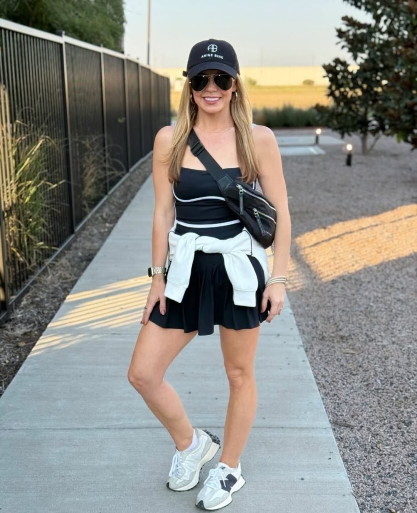 Black slides and a simple crossbody bag keep the outfit practical, while a baseball cap adds a sporty soccer-mom vibe. It’s an effortlessly chic look that blends comfort with style.