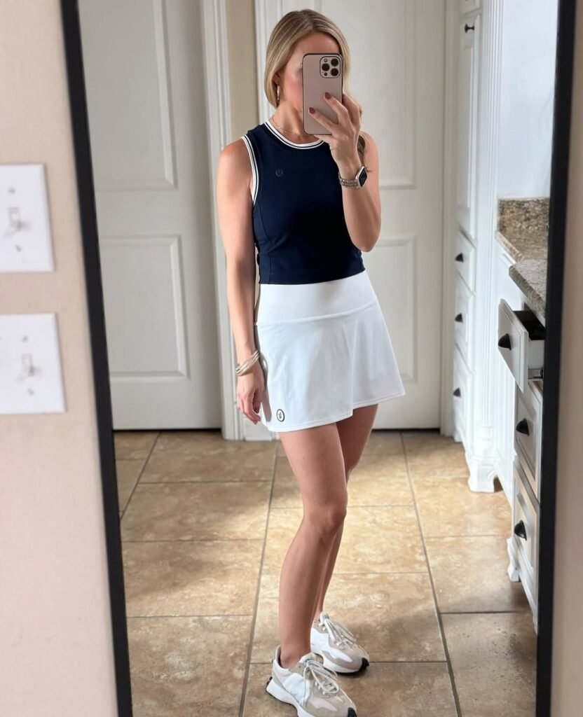 The chic navy top paired with a crisp white skirt creates a look that feels both polished and relaxed. Its simple design gives off a sporty yet elegant vibe that works perfectly for casual outings or game days.
