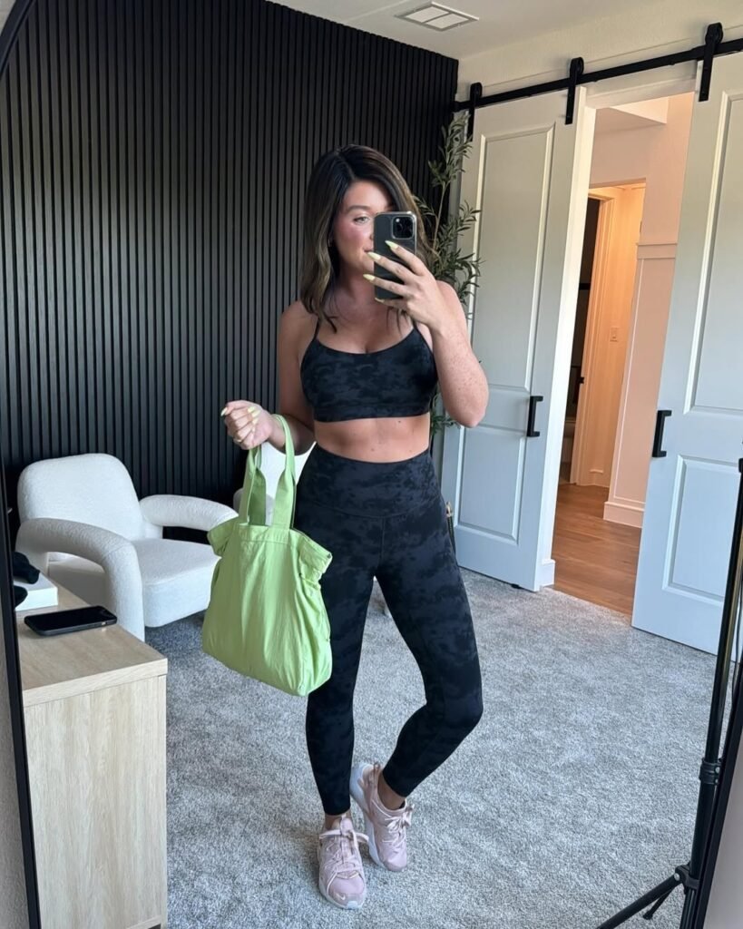 Blush pink sneakers and a vibrant green tote bring a fun pop of color to the look. It’s the perfect outfit for gym sessions, errands, or any active day on the go.