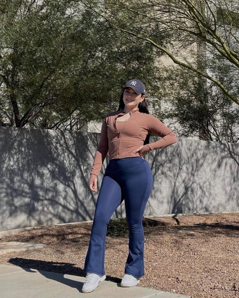 A rich brown zip-up jacket paired with navy flare leggings creates a look that feels both sporty and effortlessly put together. The combination balances casual comfort with an athletic vibe that’s perfect for busy days.