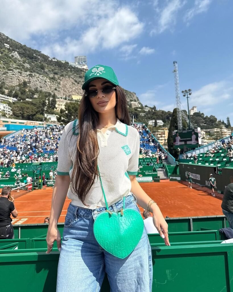A heart-shaped handbag adds a quirky charm, while the matching green cap ties the outfit together. It’s a laid-back yet fashion-forward look perfect for game day or weekend brunch.