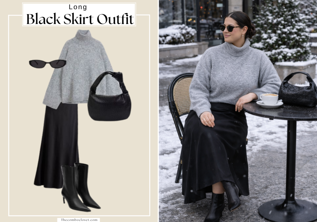 This look embraces cozy winter dressing with a touch of effortless elegance. The long black skirt is paired with a relaxed grey turtleneck, creating a soft contrast that feels warm and inviting.