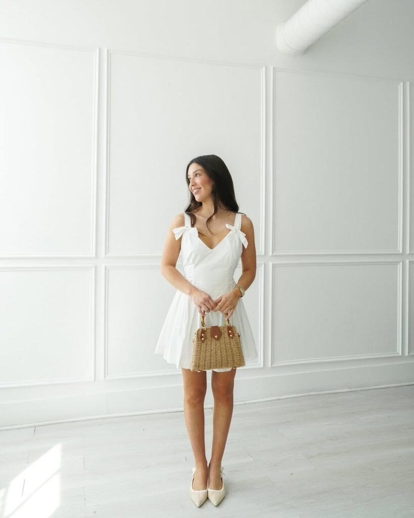 White dress with bow straps is perfect for graduation day—fresh, chic, and light! It’s simple yet stylish, offering a playful, elegant vibe without being too formal.
