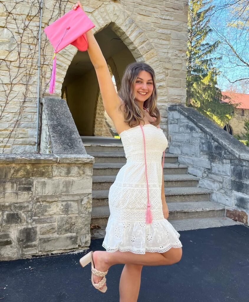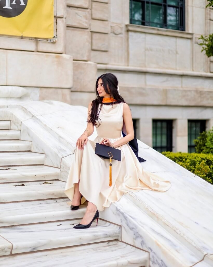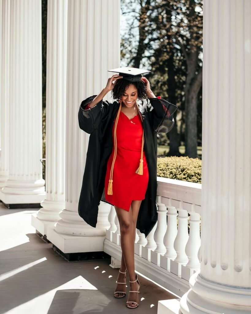 It’s a fun yet classy outfit that balances elegance and style without being too over the top, and it complements the graduation gown perfectly!