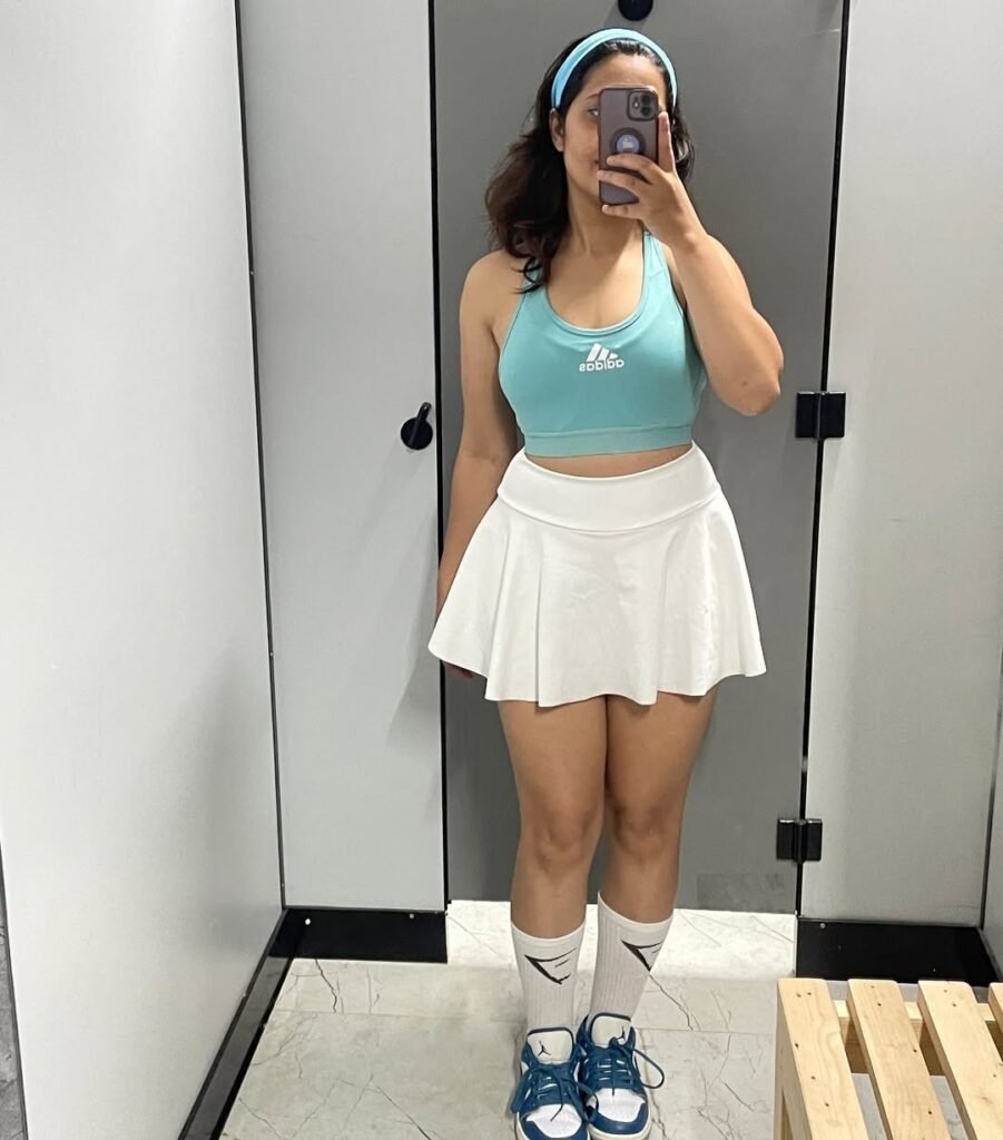 This sporty yet stylish gym outfit features a turquoise sports bra paired with a flared white skirt, creating a playful and fresh look.
