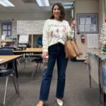 A soft green top paired with classic denim keeps the look fresh while the darker tones ground it.