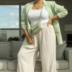 This look pairs a light polka dot top with deep-toned trousers, creating a clean and well-balanced outfit. The contrast feels fresh while still looking polished and easy to wear.
