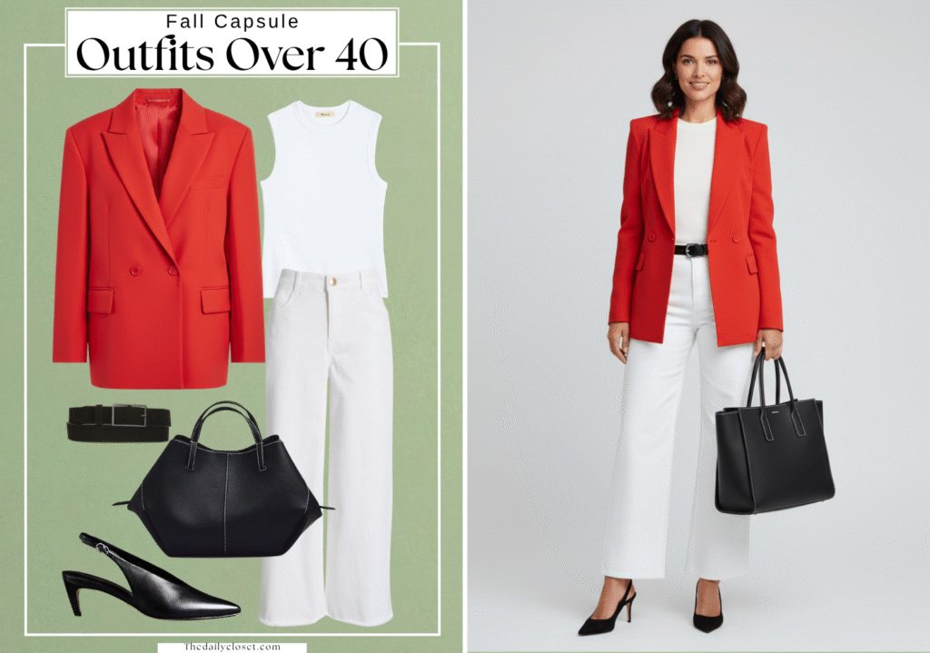 Smart, sharp, and confident-forward for work or dinner. Crisp white base lets the bold red blazer shine, anchored by sleek black accessories.