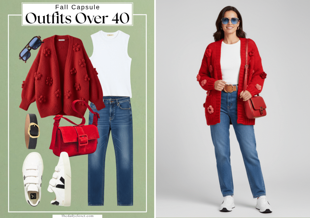 Casual, comfy, and cheerful for errands or brunch. Textured red cardigan pops against a crisp white top and classic blue denim, grounded by sporty white sneakers.