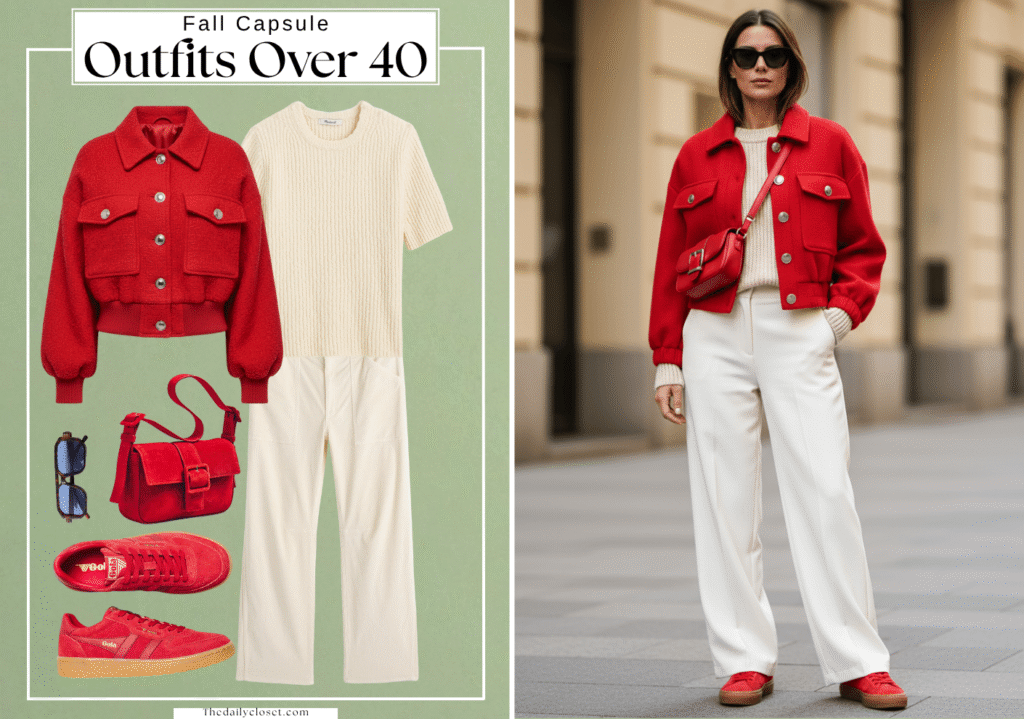 Relaxed, modern, and city-ready for coffee runs or weekend strolls. Creamy knit and pants create a clean base, popped by a cropped red jacket and matching suede sneakers.