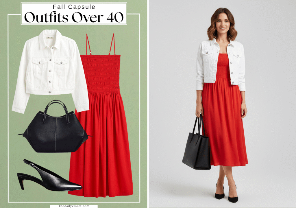 Polished, easy, and day-to-dinner ready. Crisp white cropped jacket lightens a red smocked midi, finished with sleek black accessories for contrast.