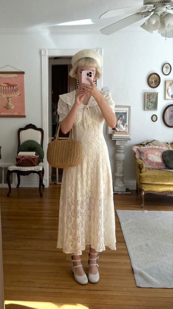 Pairing this look with white Mary Jane shoes and a cute wicker bag elevates the vintage-inspired style, making this ensemble perfect for brunches, picnics, or garden parties.